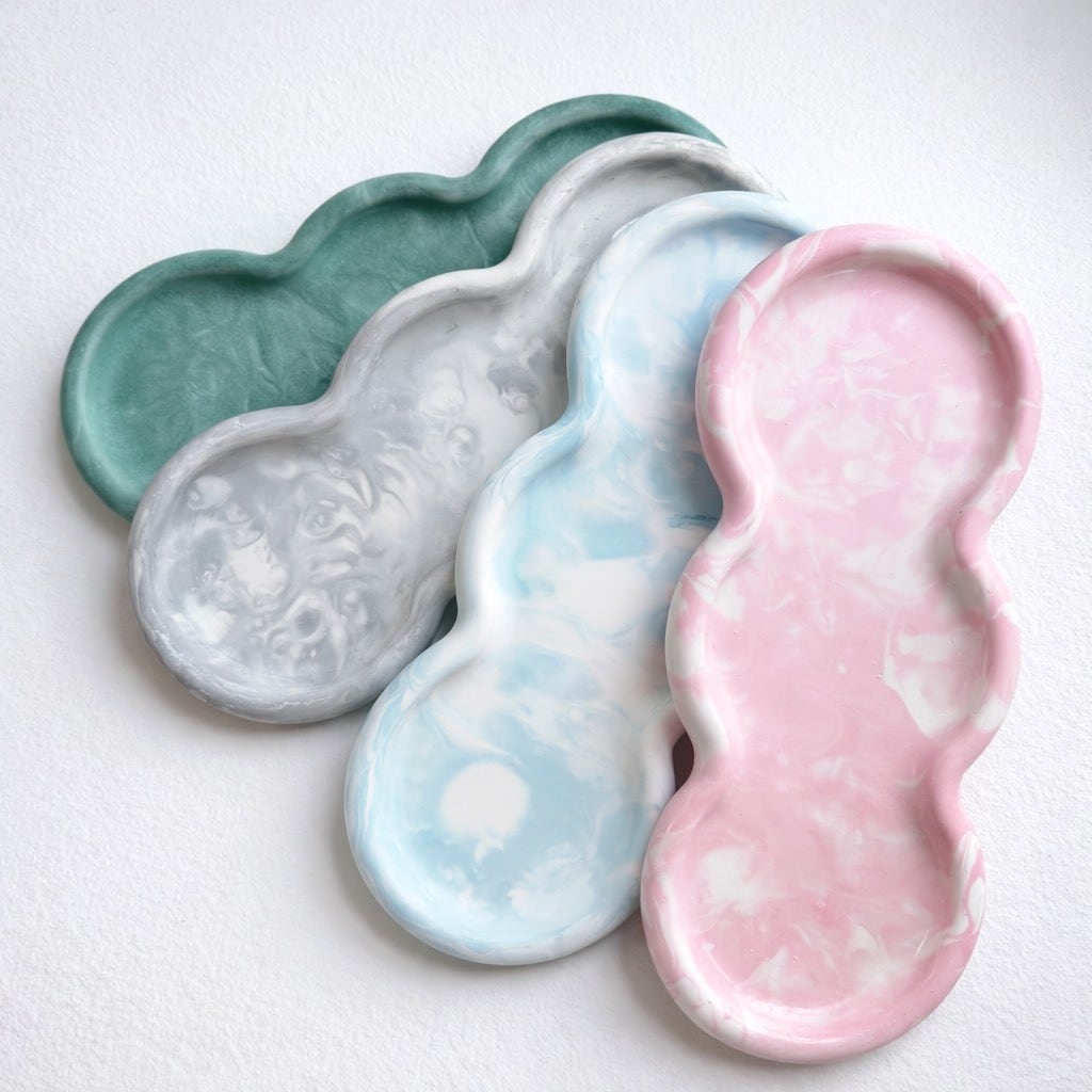 やさしいマーブル模様が魅力の、くびれ型トレイです。